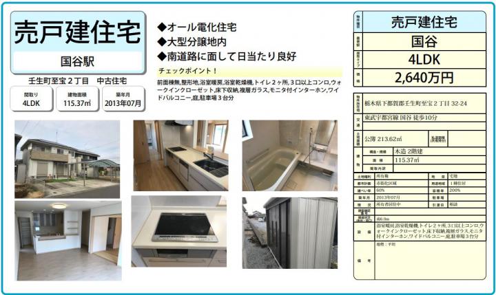 東武宇都宮線 国谷駅 徒歩 7分 | 栃木県下都賀郡壬生町至宝2丁目 | 専有面積/213.62㎡ 建物/115.37㎡ | 2013年07月 | 2,640万円(税込) | 4 LDK |